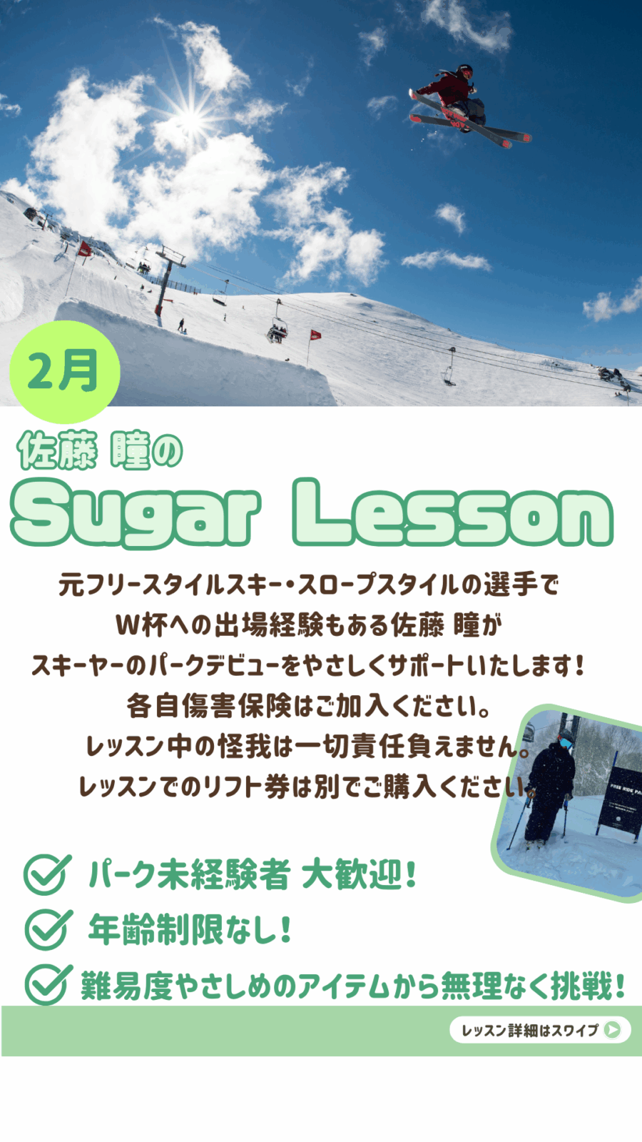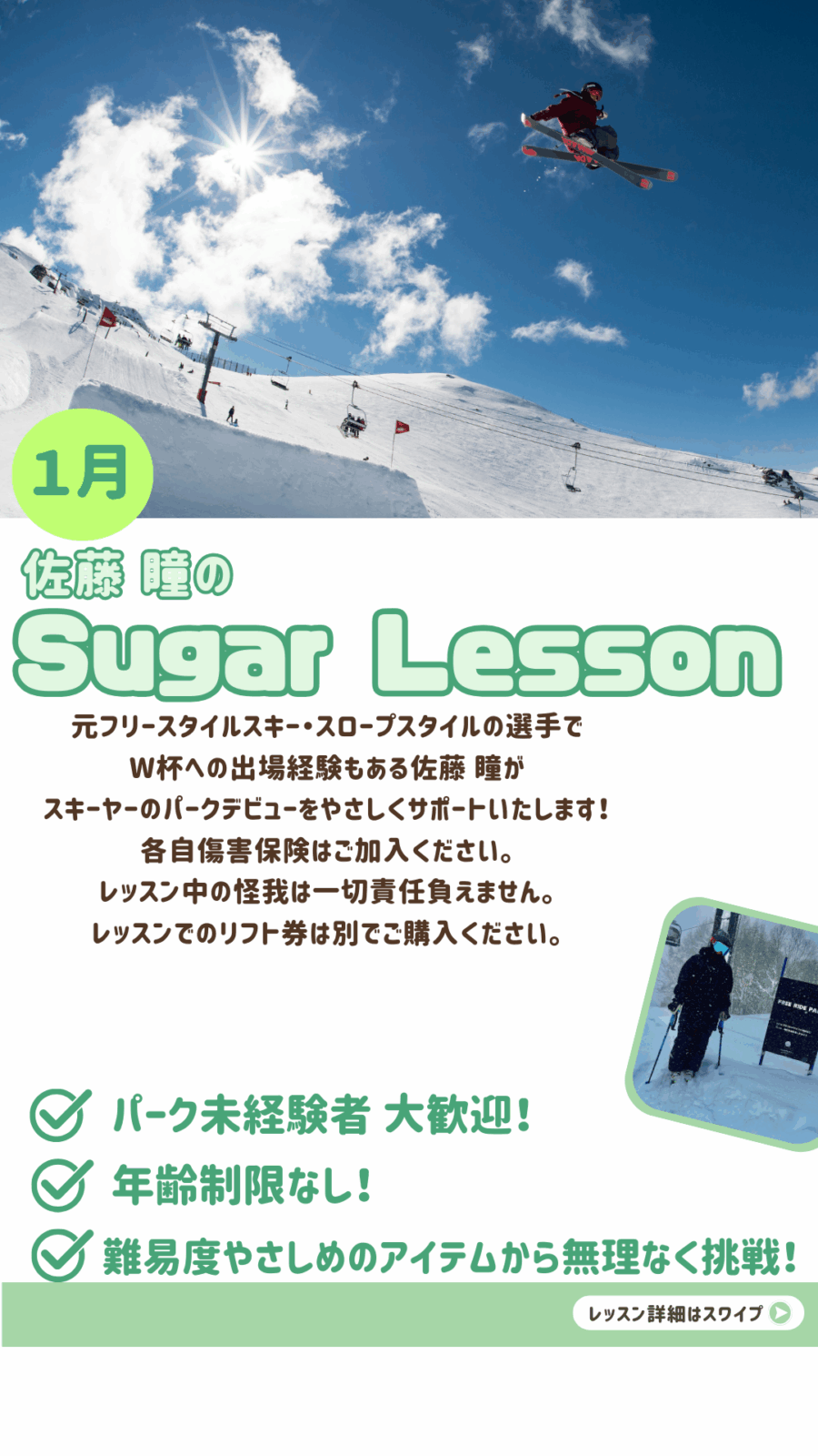 元フリースタイルスキースロープスタイルの選手でW杯出場経験もある佐藤瞳さんから受けられるレッスンのご案内となります。