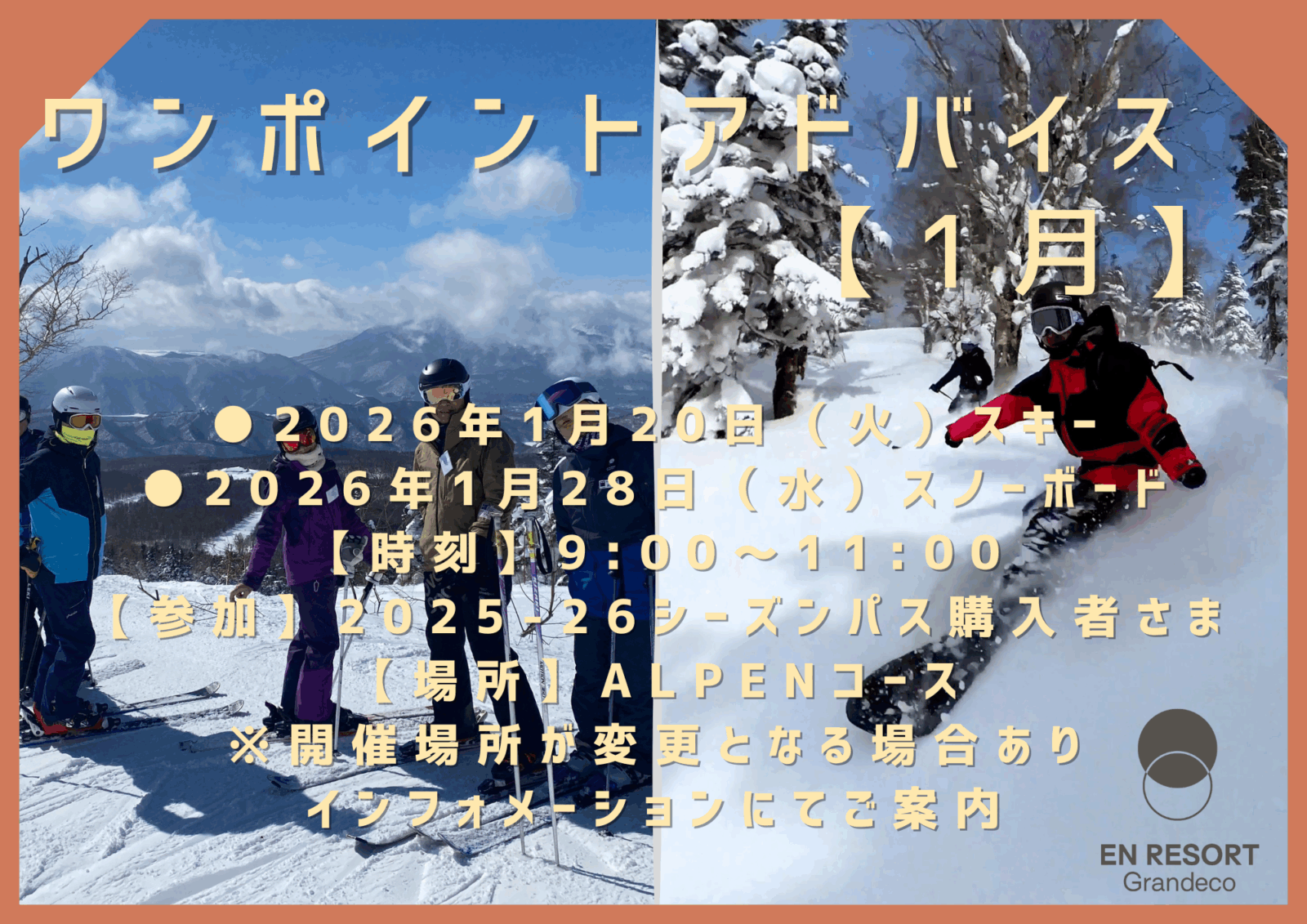グランデコが誇る講師陣による「ワンポイントアドバイスDAY」にご参加いただけます。毎月1~2回ほど実施予定。シーズン券をお持…