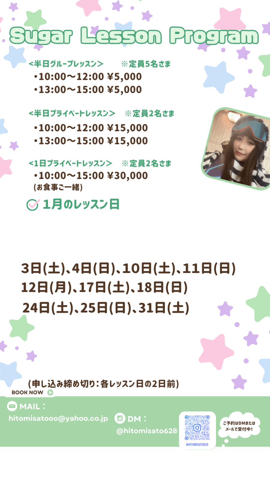 | 対象 | 申込は2日前までに佐藤瞳さんへDMまたはメールにて予約 ※詳細は下記画像参照 |