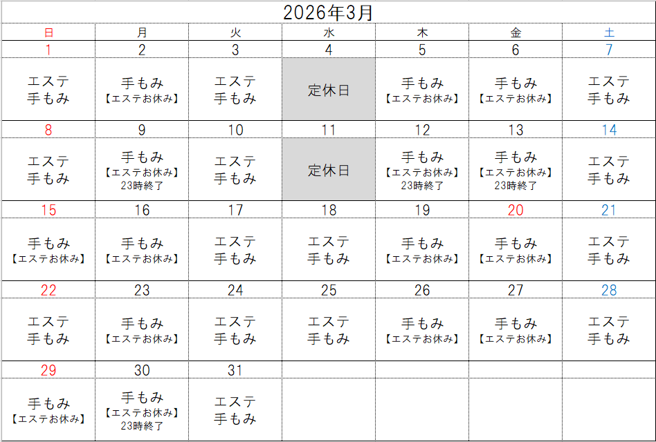 北館1階 リラクゼーション(手もみ・エステ)につきまして、3月営業日のご案内をさせていただきます。